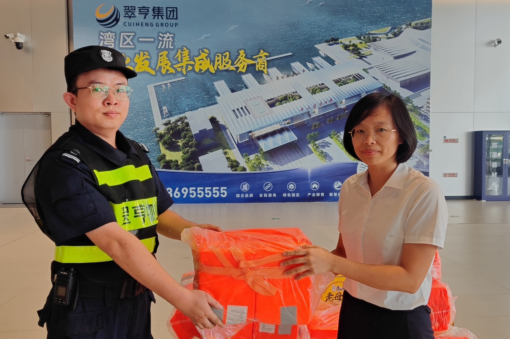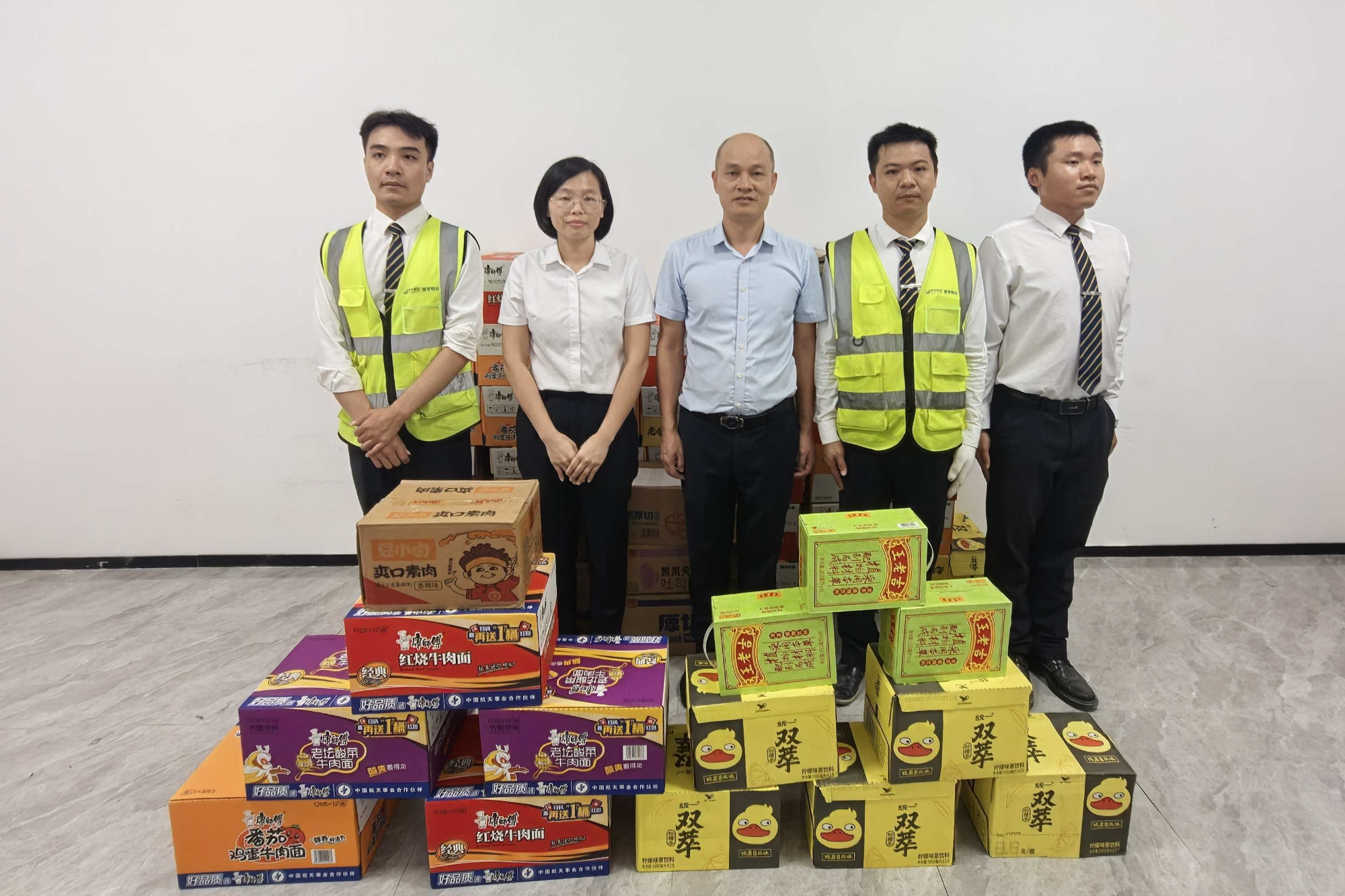 面对台风可能带来的交通中断、物资短缺风险,公司提前启动后勤保障预案。饭堂储备了可满足全员 3 天食用的米、面、肉、菜等食材,确保内部人员饮食无忧;同时,针对各保安物业派驻点分散、部分点位偏远的特点,专门采购 100多箱方便面、面包和矿泉水,由后勤组专人专车配送至每个点位。当偏远派驻点的保安接过沉甸甸的物资时,那句 “有公司做后盾,再大的风雨我们也能挺过去”,正是对这份保障的最好认可。