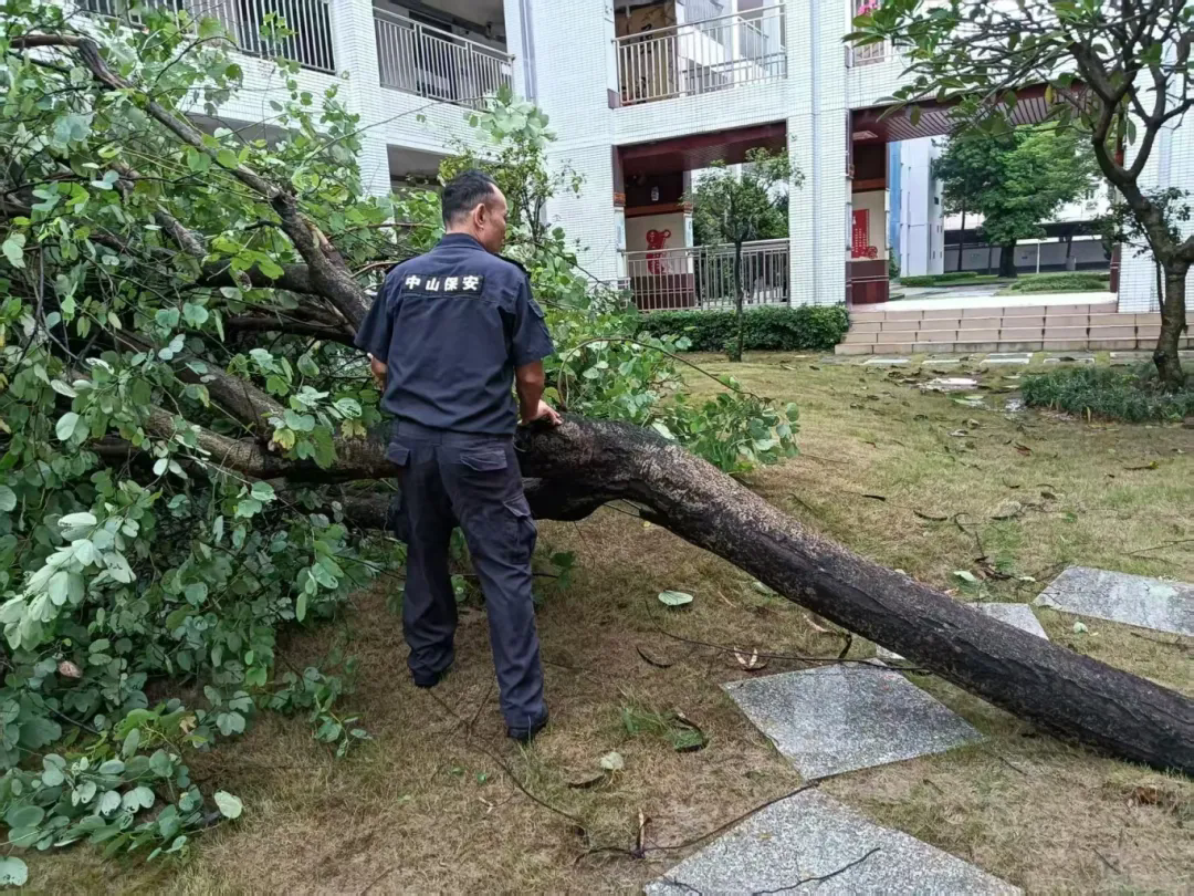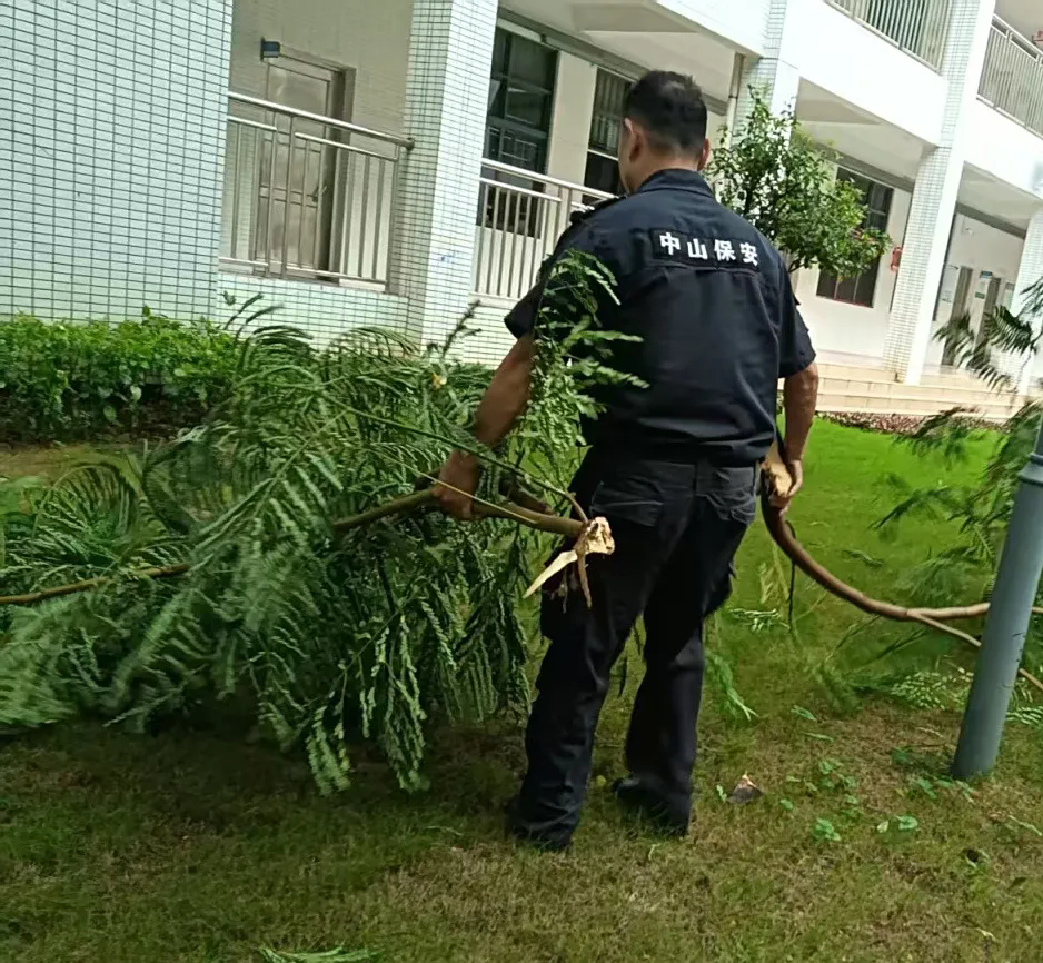 狂风裹着暴雨肆虐,台风 “桦加沙”来势汹汹。当大家都躲进室内避险时,中山市保安服务有限公司有这样一群人,以责任与担当筑牢安全防线,始终坚守在岗位一线。