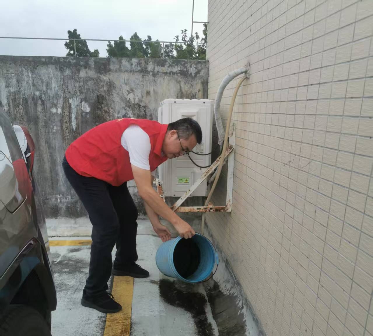 志愿者在公司大院内倾倒积水